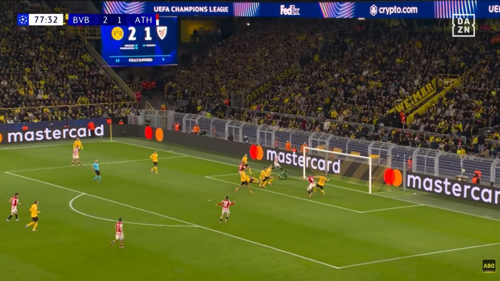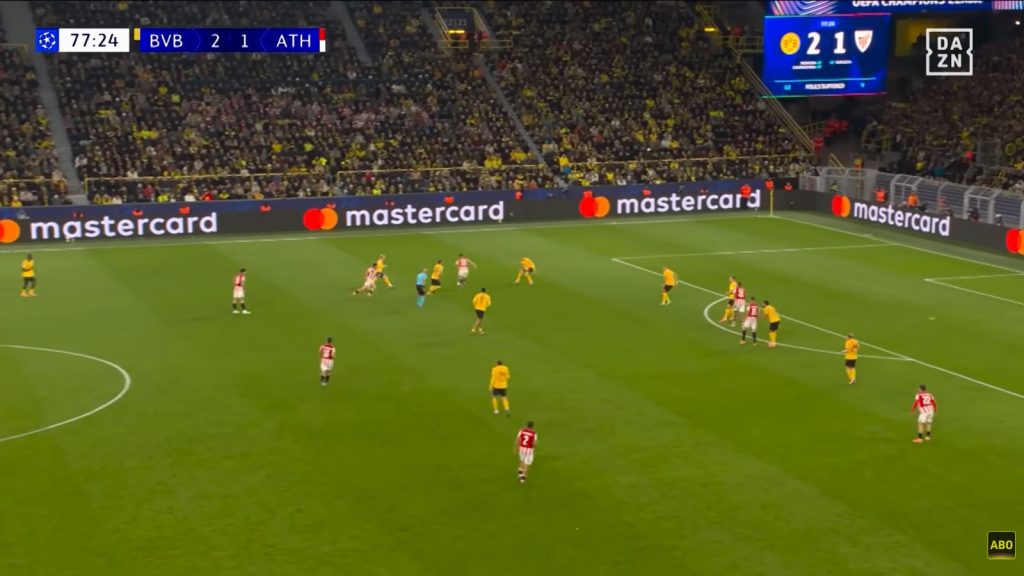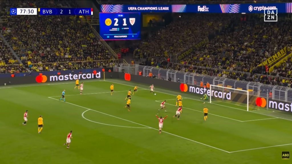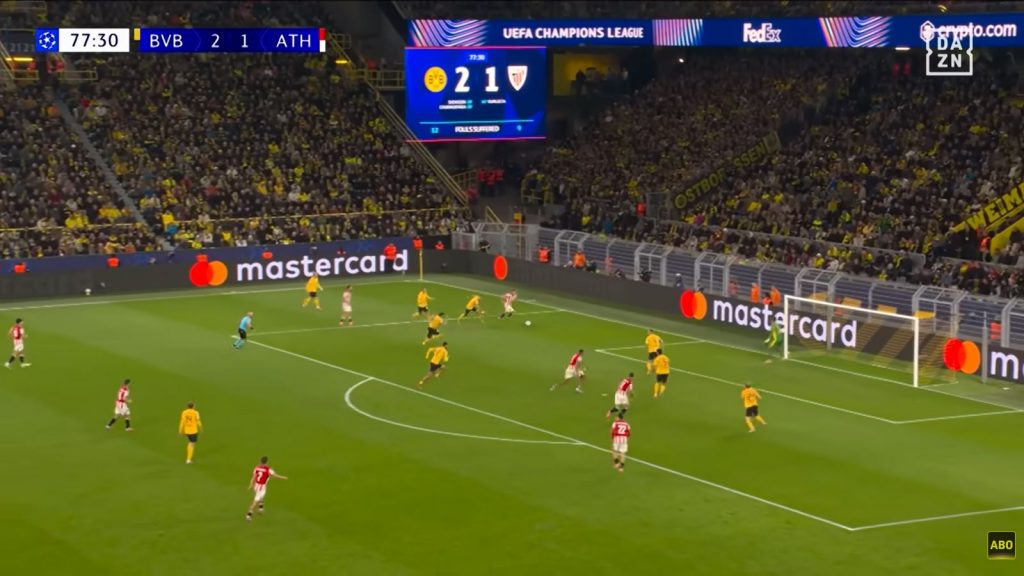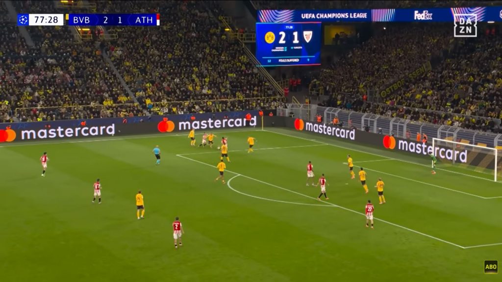 Zwei Spieler Athleticos setzen sich auf der Außenposition gegen 4 Dortmunder durch, darunter bereits der rechte Verteidiger der 3er Kette, der sonst nichts zu tun gehabt hätte (-> komme ich drauf zurück). Im Strafraum warten Stürmer & hängende Spitze gegen 2 BVB-Verteidiger, am 16er wartet der 2. Flügelspieler.